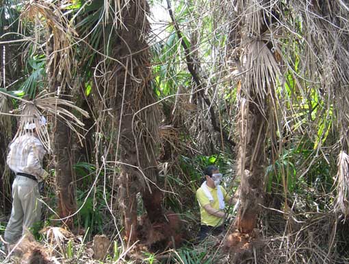 第1回/「お茶の水女子大学」お茶の水女子大学は宮内庁豊島ケ岡御陵や護国寺などとともに文京区大塚周辺のまとまった緑の一角をなしており、 各種昆虫はもちろん、時折オオタカのような生態系上位の大 形補食者が飛来するような場所です。 敷地内には数多くの樹木がありますが、人があまり立ち入 らず、二次林の更新が行われていない場所では、植生のバラ ンスが崩れ、近年はシュロとクズの繁茂によって、本来あっ た広葉樹が立ち枯れしているのが観察されました。 そこで、2007年3月から在来の樹木を圧迫しているシュロ の伐採、伐採跡に昆虫の食樹を新たに植える作業、さらに蝶 などの蜜源となる花を植える作業を開始しました。 <シュロの繁茂について>← クリック ![]() お茶の水女子大学 ![]() 実施場所(緑の部分) ■活動の状況(2007年3~5月)![]() ![]() 以前はクリやカキなどが植えられた自然学習用の庭園でしたが、 あまり利用されなくなったため、シュロとクズが鬱蒼と茂るよう になりました。そこで、シュロやクズ、それらに圧迫されて枯れ た樹木を取り除く作業を開始。 ![]() シュロやクズなどの草を取り除いていくと、少しずつ元の庭の様 子が分かるようになりました。中央のサクラが上から2番目の写真 の左端に写っている木です。 ![]() このシュロの切り株を見るとその密生具合が分かります。中央の 木の幹は元からあったカキの木。回りにこれだけのシュロが生え、 またクズがからみつき栄養と日光を奪っていました。中にはすで に手遅れとなって枯れた木もあります。 ![]() ![]() シュロや蔓植物の侵略で衰えた木は枯れた枝を切って負担を減ら し、完全に枯れてしまった木は伐採分割し、朽ち木にすむ生き物 のすみかとして積み上げておきます。 ![]() シュロや立ち枯れた木を取り除き、茂り過ぎた草を刈ると広々と した場所ができました。 ![]() 小回りの効く小型耕耘機で、樹木や切り株の間を耕します。立ち 枯れの切り株は昆虫などが利用します。 ![]() ![]() 各地で入手した苗木。ここに写っているのはほんの一部です。ミ カンには植える前からアゲハがやってきて、たくさんの卵を産ん でいきました。 ![]() ![]() ![]() 日当りや水はけなどを考えながら苗木を植えます。全体の中で特 に楽しい作業です。 ![]() 植え終わった苗木。今後は手入れをしながら育ち方を観察します。 ■活動の概要●植樹数/100本●植樹した主要な種 クヌギ、コナラ、クリ、エノキ、カエデ、ナシ、ミカン、 サンショウ、アケビ、クチナシ、フジ その他・・・蜜源としてブッドレア等を植えた。 ●参加ボランティア 延べ60名 日本昆虫協会会員、日本アンリ・ファーブル会会員、 お茶の水女子大学学生教職員、埼玉大学学生OB、一般 ●助成 イオン環境財団 |